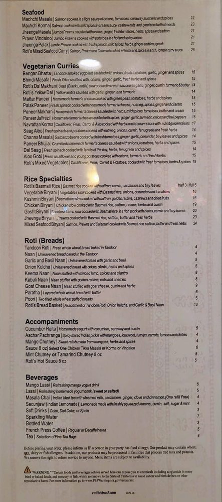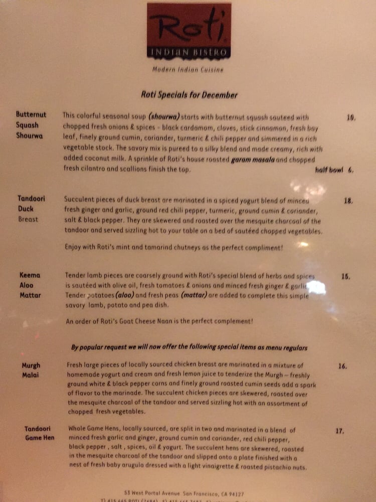 Roti Indian Bistro, located at 53 W Portal Ave in San Francisco, offers a wide range of Indian cuisine options in a casual and welcoming atmosphere. With vegan and many vegetarian choices available, this Asian-owned restaurant caters to a variety of dietary preferences. Customers praise the attentive service and delicious curries with just the right amount of spice. The Chicken Tikka Masala and Chicken Biryani are standout dishes that consistently impress diners. The cozy ambiance and flavorful cocktails make it a popular spot for celebrations and special occasions. Despite occasional noise levels during peak times, Roti Indian Bistro consistently delivers high-quality meals that showcase the healing power of caring and food. Don't forget to make a reservation to secure your spot in this bustling restaurant.